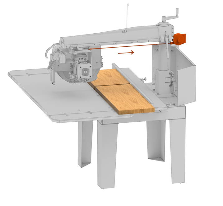 Radial-arm saw for straight (90°) cross cutting and bevel cutting at 45° left and right. The movement of the cutting unit along the arm, on guides and ball bearings, is manual, aided by a return spring, so is the blade tilting with mechanical locking system at 45° left. The pillar group is made of cast-iron and fixed on a solid frame and legs made of steel. Working bench in MDF. Manufactured according to EC standards.